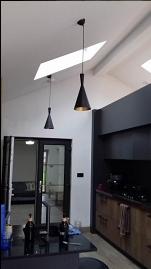 A typical medium-sized project in Headington, Oxford, but packed with features. The open ceiling with four roof windows redeems and lightens the living area of kitchen and informal dining space with garden views. Under the mezzanine storage area are two bath/shower rooms and a study.