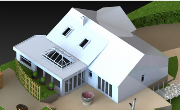 This client wanted to replace a small porch/study on the north, rear, side of his bungalow with a larger orangery/dining room, and link it to an outdoor terrace. Unresolved was the loss of a useful study space.
